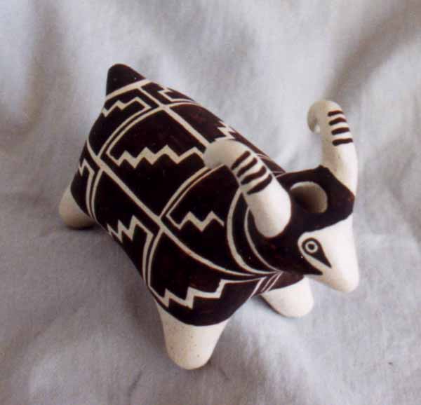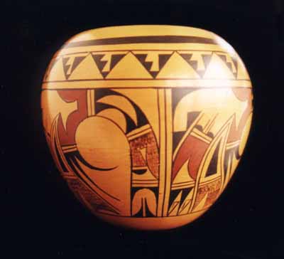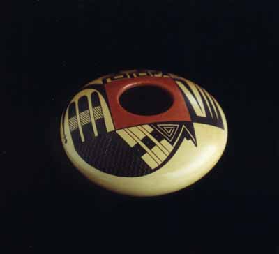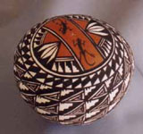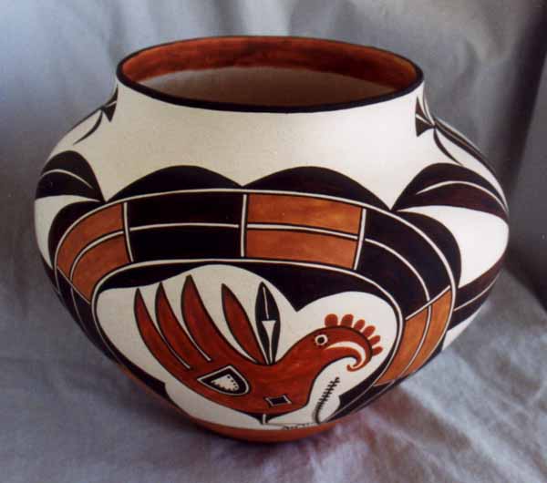 Sandra Victorino, niece of Dorothy Torivio ( considered one of the three ranking superstars in Acoma pottery) is her inspiration . Sandra is accomplished in her own right, winning prizes at Indian Markets in Gallup, NM: Dallas, TX; and the prestigious Santa Fe Market. One of her pots is featured in "Southwestern Pottery from Anasazi to Zuni" by Allan Hayes on page 55. Sandra's pottery was recently made part of the permanent collection at the Heard Museum in Phoenix. She is constantly experimenting with new shapes and intricate designs, every pot is completely different and it is easy to enjoy a collection of several pieces without the feeling of owning an matching set. |