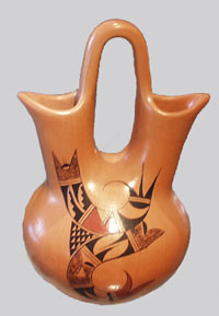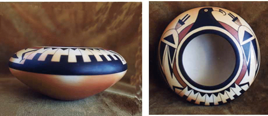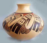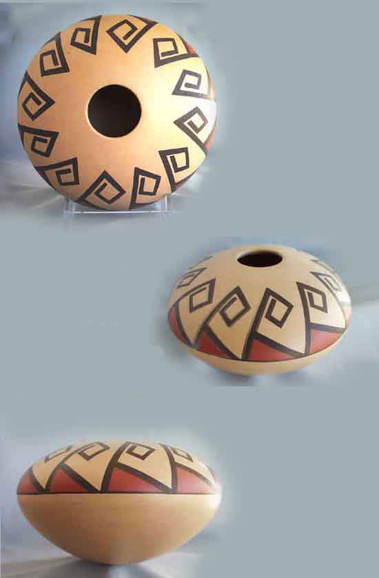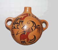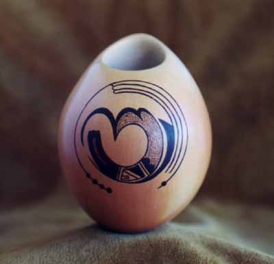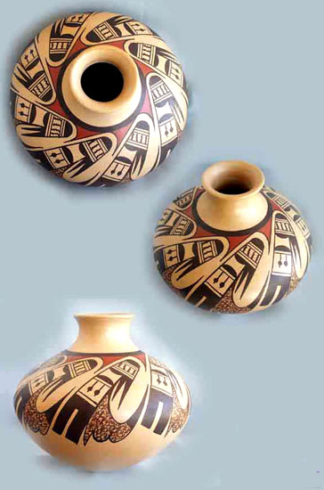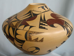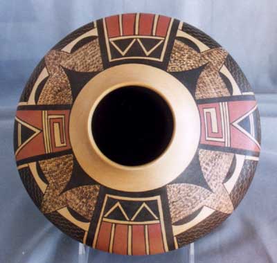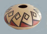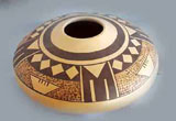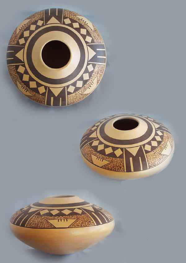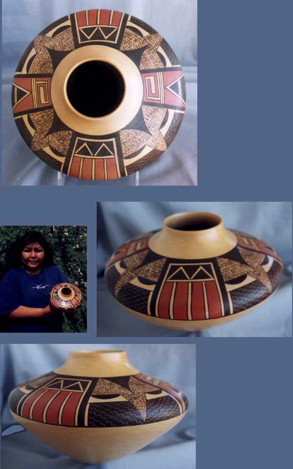 | Karen Abeita is a member of the younger generation of artists who work hard to keep their traditions alive while coping in the modern world. She sees her work as a mission and a duty to ensure that her people's culture endures. She learned her art from potters of her own generation, most notably Fawn Garcia Navasie and Mark Tahbo. Her pottery blends very traditional Hopi-Tewi designs with her respect for the materials of the earth . Her awards are numerous – including Best of Show, "Invitational," Lawrence, KS. She is in all the major books recently published on Hopi pottery. |