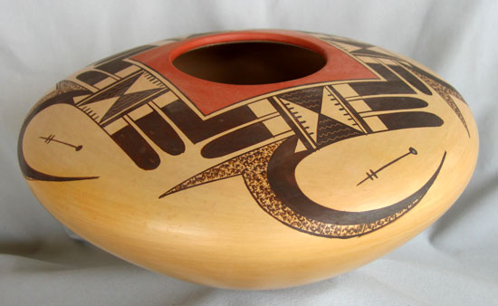 | Karen Charley Karen Kahe Charley who has been making pottery since 1980. She is the daughter of the legendary potter Marcella Kahe, who is her inspiration and teacher. Her work incorporates very traditional Hopi-Tewi designs and although she lives in Keams Canyon, she returns to her mothers home on first mesa for inspiration to paint and fire her pottery. Her awards are numerous from Best of Show at both the Museum of Northern Arizona and Santa Fe Indian Market to the Fred Kabotie Award. She is in all the major books recently published on Hopi pottery and has had exhibitions at both Harvard and Yale Universities. Karens works which is on display at the both prestigious Heard and Northern Arizona Museums is very limited and collectible. |