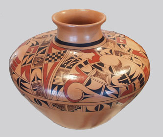 Dorothy Ami is one of the premier young Hopi potters. Her work is innovative in design, shape and clay colorations. Her fine line designs are carefully drawn and beautifully painted using a single strand of yucca and all natural pigments. Dorothys work is clean and crisp. This is no surprise when one realizes that the award winning and extremely talented Hopi potter, Mark Tahbo, has been her mentor and teacher for several years. Dorothy believes in producing fewer pieces, but ones of the highest quality and workmanship. This large pot is an outstanding example of Dorothys work. Its graceful shape is enhanced by the intricate designs painted on all four sides. A variety of kachinas ( Mother Earth; Kokle or the Story Teller; Konin or Supai Kachina) some found in old Sikyatki designs, can be seen around the neck of the vessel. Stylized eagle feathers are gracefully painted below each figure and carefully crafted checkerboard designs are also incorporated on the shoulder of the piece. This pot was exhibited at the recent Pueblo Grande Museum show and was selected as one of the outstanding pieces. It is a magnificent example of Hopi pottery. |