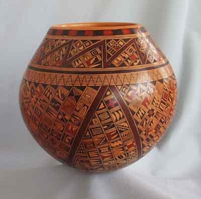 | Rondina Huma is known for her intricate work of small square Sikyatki designs. She won several awards though the years including "Best of Show" at Santa Fe Indian Market. This piece is a excellent example of her artistry which is both traditional and innovated. Her firing brings out the richness of the vases coloration and is truly superb. We are pleased to have Rondina join our gallery . |
