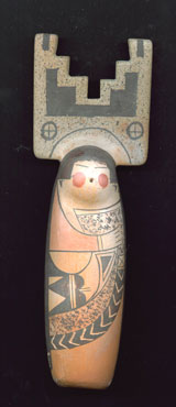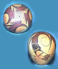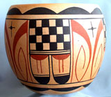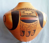 | Gwen Setalla is the daughter of Justin and Pauline Setalla and she is also related to Joy Navasie ( Frog Woman ). Both of these famous potters greatly influenced her in both technique and style. She is a master potter who makes some of the thinnest pottery at Hopi. Her painting is very fine and her polishing extremely smooth. Her finished pots are exceptional in quality and design. She is known for her canteens with corn stoppers and won a "First Place" in that category two years ago at the Northern Arizona Hopi Show. |